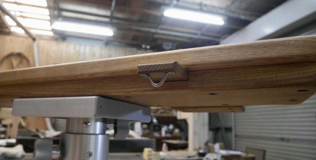真ん中あたりで折り畳む用にしてみました。折り畳みからストレートにする仕組みを色々と考えてこんな感じで平板を通す感じで天板を一枚板みたいにすることにしたのです。裏側はこんな感じです。