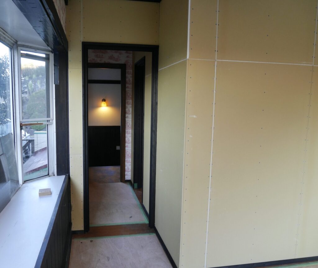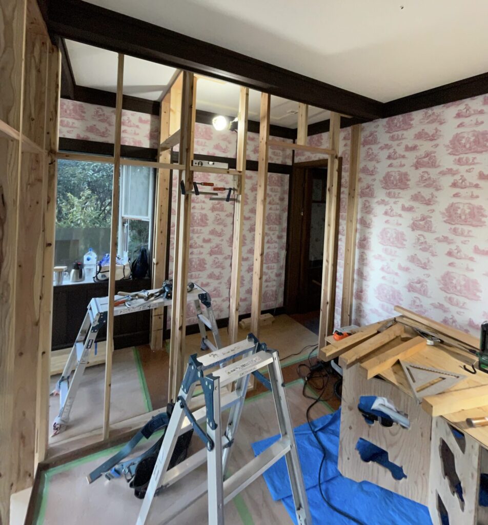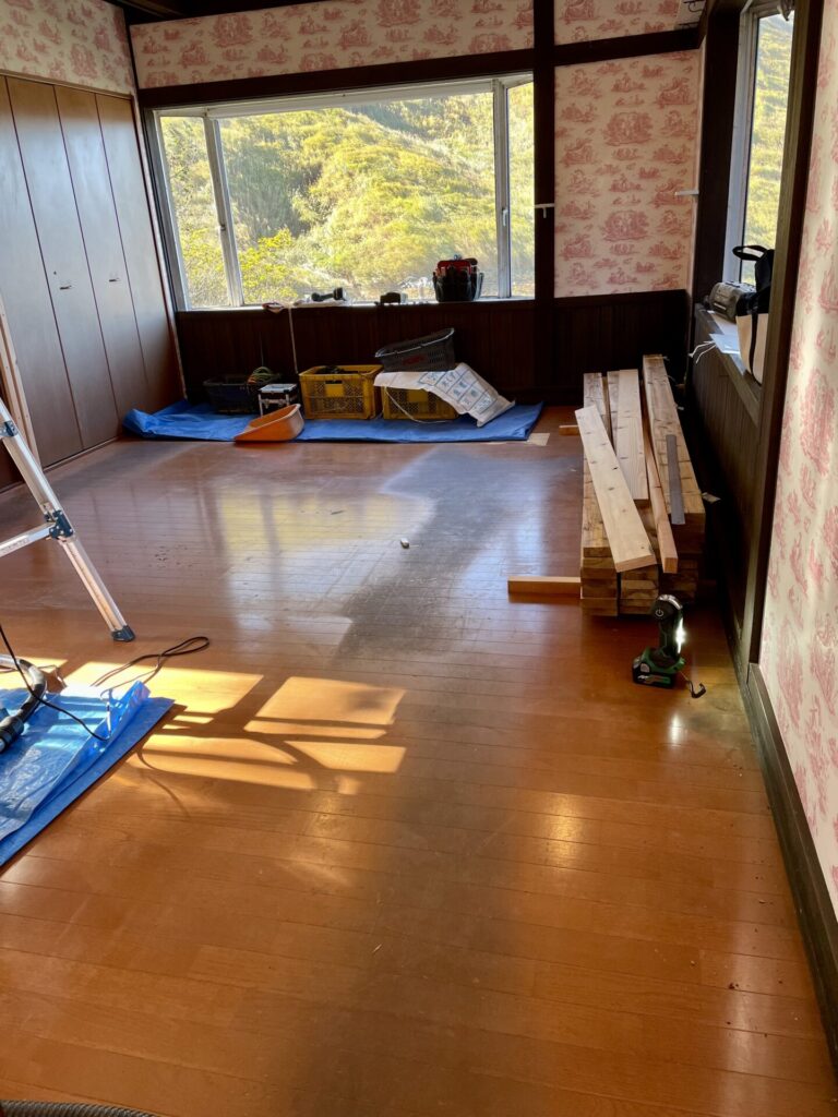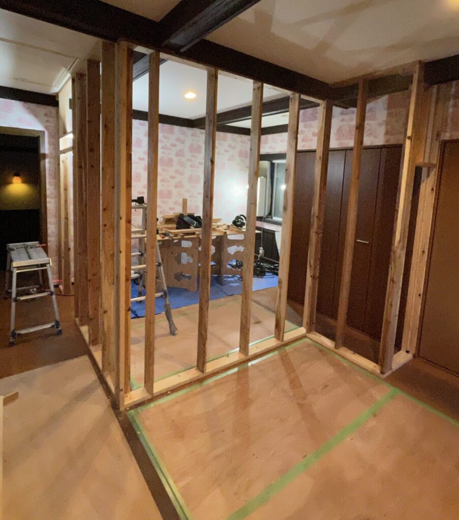 中二階の住居スペースを改装してお客様が泊まれる部屋にします。広いスペースに二つの部屋です。部屋を作り出す所です。