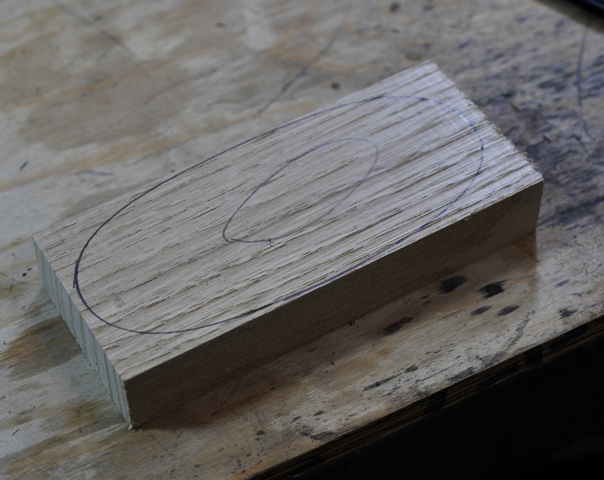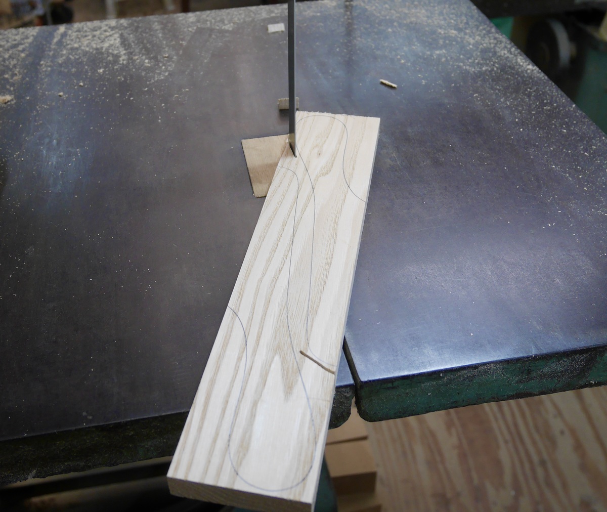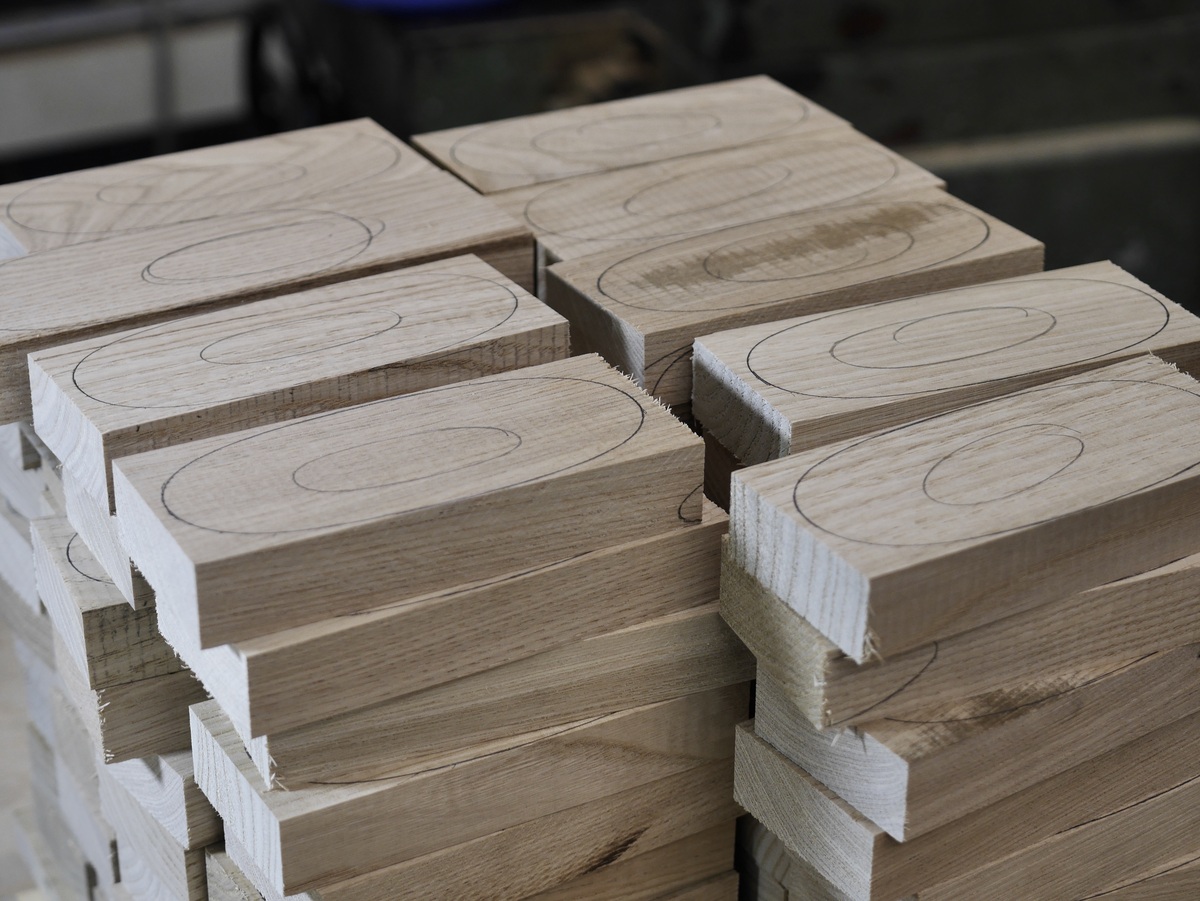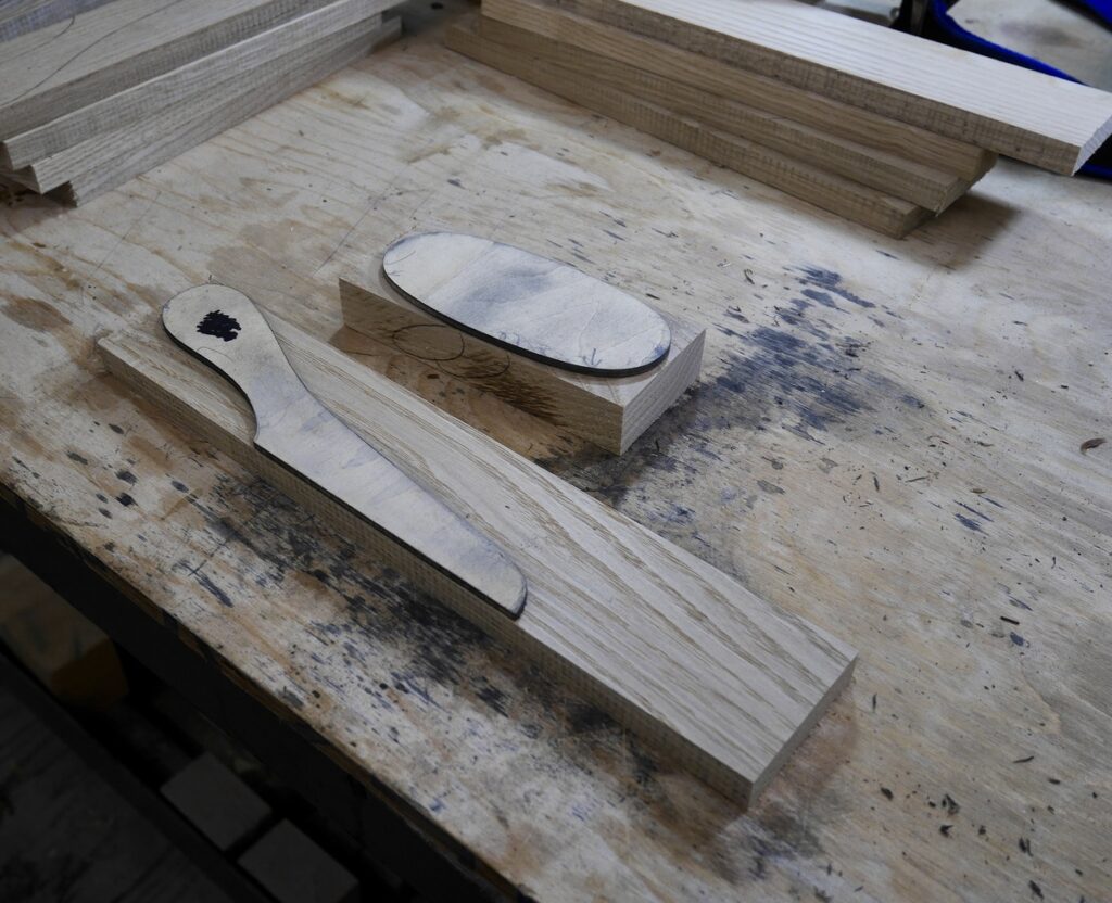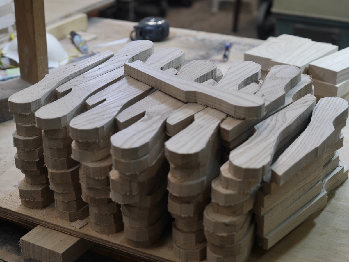 型紙板で型を取り帯鋸で木取りをしていきます。